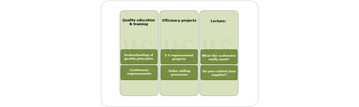 Tailor made training and education in quality issues based on the specific needs in the company in respect to industry, product portfolio, business processes and production. The tailor education can be aim differently in the organization, the scope of quality is different in the group of managers and the production team, thus the trainings program needs to be specific.